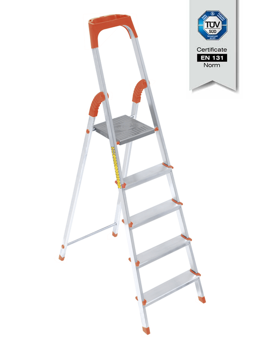 סולם אלומיניום ביתי חזק וקל משקל, עם 5 מדרגות ופלטפורמה עליונה לעמידה יציבה ובטוחה.