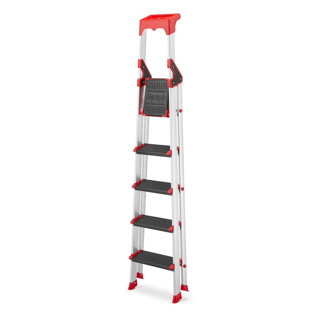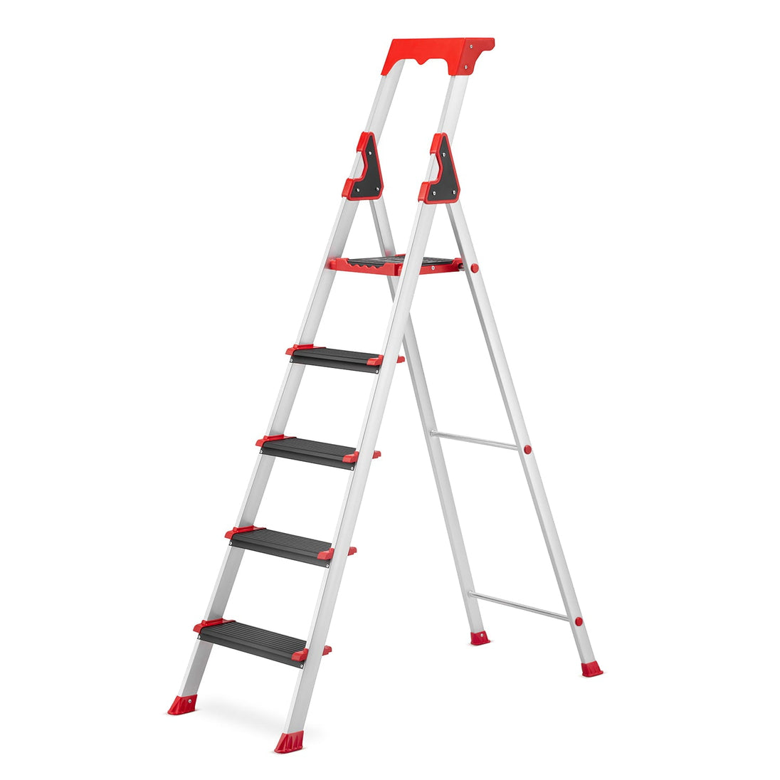 סולם אלומיניום איכותי במיוחד עם 5 שלבים רחבים, כולל פלטפורמת עמידה יציבה.