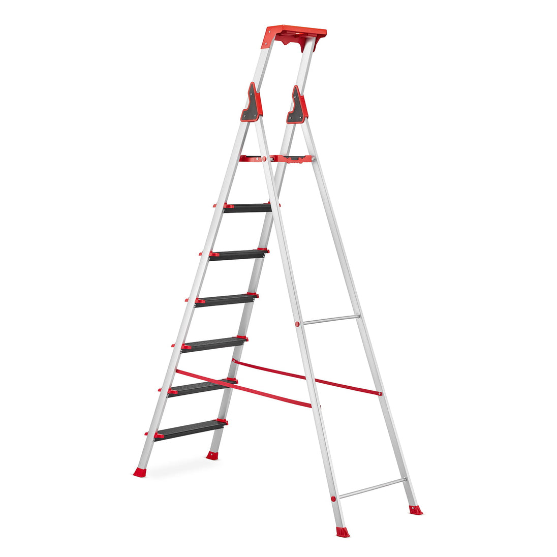 סולם אלומיניום חזק ואיכותי עם 7 שלבים רחבים, כולל פלטפורמה עליונה נוחה לעמידה ממושכת.