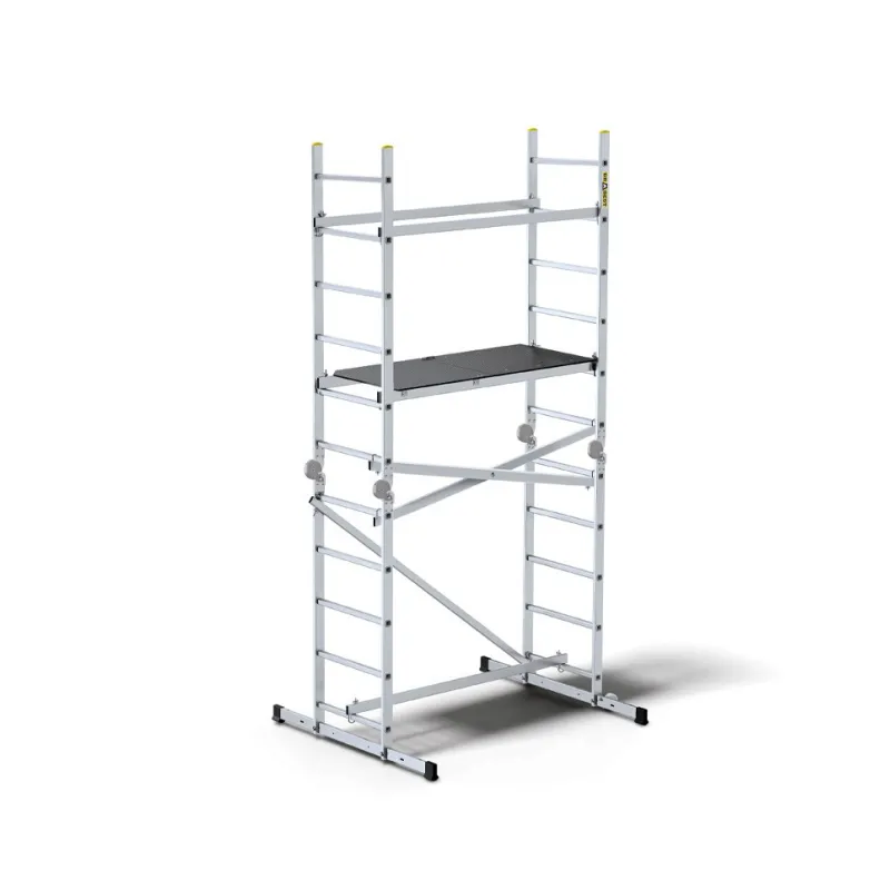 פיגום אלומיניום נייד ואיכותי, עם מבנה מודולרי חזק ושימושים מגוונים: סולם דו-צדדי, סולם נשען או פלטפורמת עבודה רחבה.